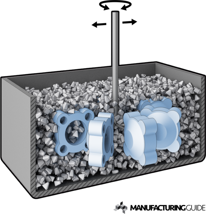 Polishing process where multiple workpieces are dragged through a vessel with abrasive chip. Beskrivning The process One or more workpieces are mounted on a carousel which is immersed in a vessel filled with abrasive chips and liquid. The carousel is rotated and then pulled in different patterns of movement through the chips to smooth and polish the surfaces. Depending on the workpiece material, design, and the desired result, a variety of sizes and shapes of chips are available. Drag finishing