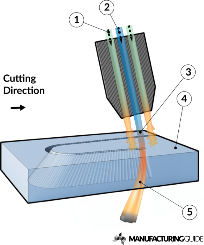 3D cutting of flat materials by combustion using fuel and oxygen. Beskrivning The process Process Combustion gas mixture [1] is burned at the cutting nozzle with the purpose of heating the material to the ignition temperature. Pure oxygen gas is supplied through the center of the die [2], which supplies the additional energy needed to carry out the actual cutting. This cutting beam [3] helps to melt and burn the material, and thus creates a cut in the workpiece [4]. Material residues is pushed away from the section of the oxygen gas in the form of a slag stream [5]. The oxygen purity and outflow rate, which is largely influenced by nozzle design, greatly affects gas cutting results. What fuel gas is chosen depends on several factors such as thickness of the workpiece and the time for heating. The cutting head is positioned usually by means of a portal system in combination with additional shafts to provide tilting and rotation. The systems are designed for angled cutting of flat plates and to some extent also for cutting curved surfaces but does not have the same slant opportunities and working range as full 3D cutting. Positioning can also be by means of industrial robots where the accuracy of position can be held within desired tolerances. By nesting details can be placed in a way that minimizes wastage of material. Nesting By placing the details in an optimal way, you can minimize spillage and average set up time per detail when cutting sheet metal Read more Gas cutting 3D of flat material Process films Standards Only for logged in users. Become member or login.