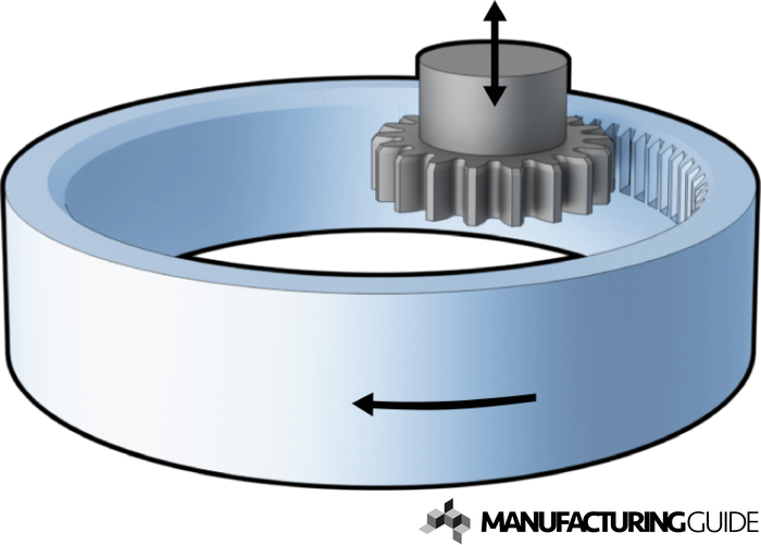 Chip-breaking process where internal gears are machined using cutters shaped like the tooth space. Beskrivning The process This method is similar to a large extent to gear planing, but the biggest difference is that this method can also be used to create internal gears. The cutting tool is shaped like a gear or a single toothed cutting tip is moved axially against the workpiece inner diameter. Tool movement is repeated until the sought after tooth depth is reached. This single cutting process is repeated for each tooth. The gear shape cutting process is continued by slowly rotating both tool and workpiece, while the tool continues the axial oscillating movement. Gear planing Chip-breaking process where gears are planed using cutters shaped like the tooth space. Read more Gear shaping Advantages and disadvantages In comparison with alternative methods Shorter cycle times suitable for mass production of large gears Tight tolerances are maintained Can generate gear teeth near the shaft Only one type of cutting tools for the same module of the gear teeth Cannot produce worm and worm gear