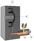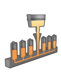 Process Forming process which uses centrifugal force to feed the melt into two or more molds.