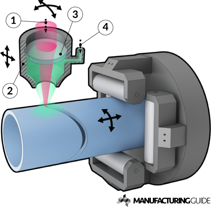 3D piece cutting by burning material by means of high intensity light generated in a laser generator and where the cutting head is controlled by a 5 axes robot or portal system and the feed and rotation of the workpiece. Beskrivning The process A laser beam [1] is generated and then directed to the cutting head [2] using mirrors. Where the beam is focused with a lens [3] and a cutting gas [4], which usually consists of oxygen or nitrogen, is supplied to the cutting head and surround the laser beam during the cutting process. The laser beam is focused [5] on the workpiece [6], which heats up, melts and partially vaporizes the material and a cutting section is created. The molten material formed during the cutting process is blown away by the cutting gas. This protects the lens from splashes from the cutting area and also makes the laser beam free of vapors that could absorb parts of the laser beam. In this method the cutting head is often controlled by a portal system or a robot arm with 5 axes in combination with feeding and rotation of the workpiece. The full freedom of movement is present in the laser head so the workpiece can be held still while the contour is being cut. LASER Translation in progress Read more Jumbo tube laser cutting 3D Process photos Process films Product examples English translation unavailable for .