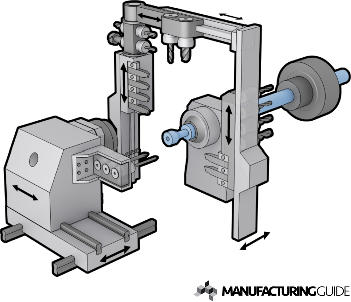 Turning process where lathe centers hold a cylindrical workpiece which is fed through the chuck. Beskrivning The process The workpiece in the form of a rod is fed out by a chuck [1] which fixes the workpiece vertically and laterally. The guiding chuck allows the workpiece to be moved axially during the processing time. The tool holder [2] control turning tools with fixed or interchangeable inserts that removes material through chip breaking for creating a rotationally symmetrical detail. The tool is placed as close as possible to the chuck and maintains this position during the machining process. The workpiece is positioned and supported by a lathe center that moves along with the axial movement of the rod. Chip breaking The way in which a chip breaks Read more Longitudinal turning Process photos Process films