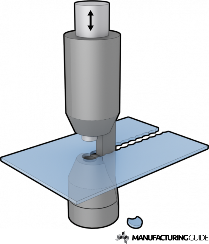 Freeform cutting of a plate with a series of cut-outs which together create a slot. Beskrivning The process The workpiece is placed on the die with a rear stop position after which the punch presses a hole. The punch is then lifted and moved over the plate until the stop position again positioning the punch that knocks out another hole. The process is repeated while the plate is rotated to create a nonlinear slit. This description applies to equipment intended solely for nibbling. Nibbling is also performed frequently as a part of Multi-operation Punching of sheet metal. Multi-operation punching of sheet metal Shearing process that removes and/or molds flat material. Read more Nibbling