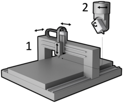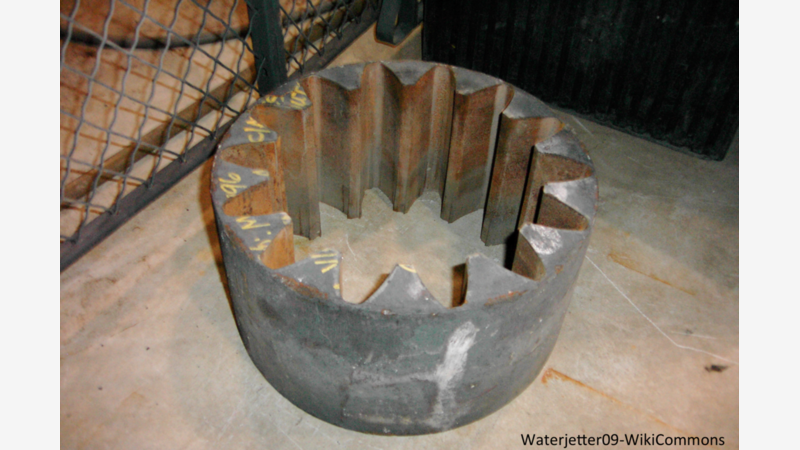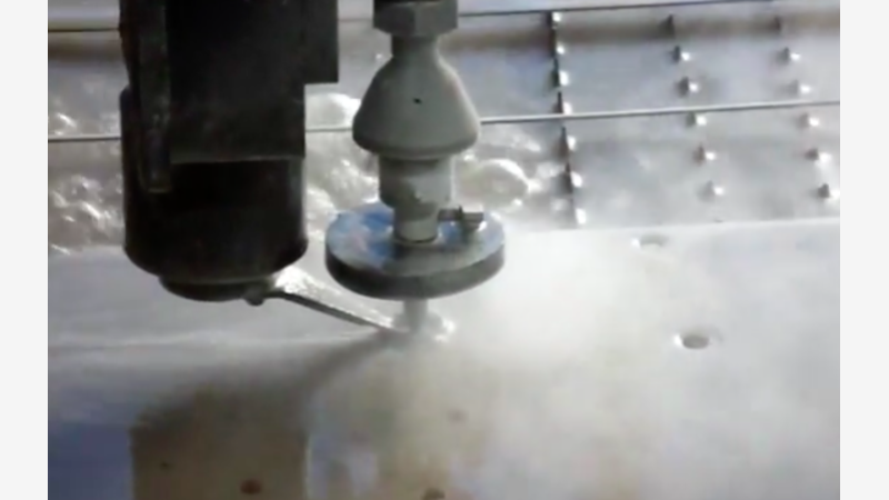 Cutting of workpiece by abrasion from a high-pressure water jet mixed with abrasive agents. Beskrivning The process Water under high pressure [1] of up to 4000 bar is focused through a nozzle [2]. Abrasive agents [3] are then supplied through the vacuum formed in the mixing chamber [4]. High pressure water jet charged with the abrasive agent then cut through the workpiece. The cutting head is positioned by means of a gantry system. Water mixed with debris is collected and filtered to partially reuse the abrasive agent. Gantry system A control commonly used for positioning a tool within the Cartesian coordinate system (X, Y, Z) Read more Abrasive water-jet cutting 2D Process photos Process films Product examples English translation unavailable for . Advantages and disadvantages In comparison with alternative methods Can cut all materials Low heat Suitable for cutting brittle and/or hard materials Slower cutting speed The cut narrows with depth