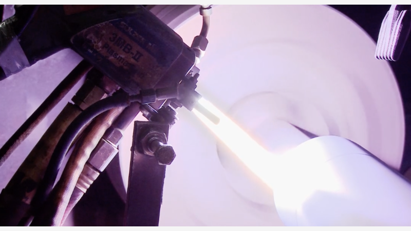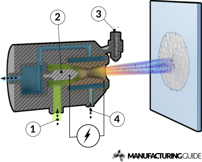 Surface coating method in which plasma is used for melting and spraying a powder onto the workpiece that is coated. Beskrivning The process An inert gas [1], usually argon, is supplied via a cathode [2] made of tungsten and past the anode made of copper [3]. The plasma was pressed at high speed out of the nozzle in which a gas-borne powder [3] is blown into the plasma jet. The hot plasma melts the powder and throws it against the workpiece to be coated. Because of the high temperatures water [4] is used for cooling. Plasma spraying Process photos Process films