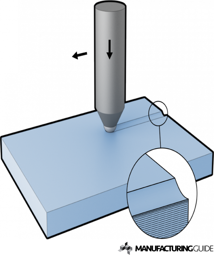 Material property-changing process in which a ball-shaped punch is pushed and pulled along the material to create residual stresses in the surface. Beskrivning The process A punch with a rolling ball whose tip is pressed against the surface of the workpiece while being moved laterally. Along the drawn line deformation occurs, causing residual stresses and resulting in hardening. In addition to making the surface harder, it also increases its resistance to corrosion and fatigue resistance while reducing the risk of cracking. Roll peening