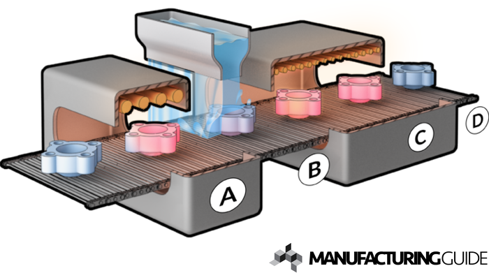 Bainithärdning är en värmebehandlingsprocess vars syfte är att omvandla stålets ferritiska struktur till bainitisk struktur. Omvandlingen resulterar i ökad hårdhet, och goda hållfasthetsegenskaper. Beskrivning Hur fungerar metoden Bainithärdning utförs genom att godset laddas i en ugn, där värms det upp till en temperatur inom stålets austenitområde. [A] Stålet hålls i temperaturen en tid, kol från ugnens atmosfär tillåts diffundera in i stålet. [B]. Godset snabbkyls ned till en hålltid i en temperatur strax över martensitens omvandlingstemperatur. Den bainitiska strukturomvandlingen sker vid denna hålltid, godset kyls sedan ned till rumstemperatur. Stål har högre löslighet för kol i temperaturer ovan 727°C, förklaringen är att en strukturomvandling då sker från BCC till FCC även kallat ferritisk och austenitisk struktur. Kolet i den kolrika atmosfären löser sig i austenitstrukturen under hålltiden. Snabbkylning av godset sker ned till en hålltid med en temperatur strax över omvandlingstemperaturen för martensit. Hela godset får en jämnare temperatur vid hålltiden samtidigt som den bainitiska omvandlingen sker över tid i detta skede. Godset kyls sedan ned till rumstemperatur. Den bainitiska strukturen ger stålet hög hårdhet och ett bra motstånd mot nötning. Segheten som erhålles vid hålltiden ger i kombination med hårdheten mycket goda hållfasthetsegenskaper. BCC Kubisk kristallstruktur där ickehörnatomen är centrerad inuti kuben. Läs merFCC Kubisk kristallstruktur där ickehörnatomerna är centrerade på kubens sidor Läs merHårdhet En metalls motstånd mot lokal plastisk deformation som uppstår vid tex repning eller skärande bearbetning. Läs mer Bainithärdning Processfilmer