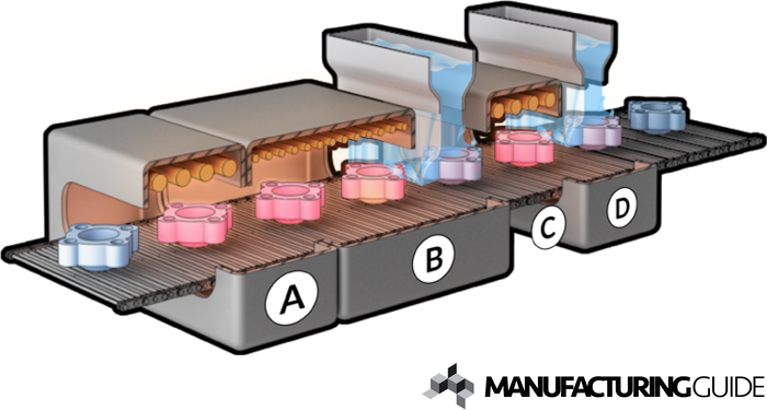 Materialegenskapsförändrande bearbetning där materialet värms upp, glödgas och härdas två gånger för att stegvist härda först dess inre delar och sedan dess yttre skikt. Beskrivning Hur fungerar metoden A: Materialet värms upp till en viss temperatur där austenit börjar bildas. B: Temperaturen hålls för att genomgå glödgning vilket minskar mängden kol i materialet för att förhindra bildande av restaustenit och cementit. C: Materialet härdas först vid den temperatur som härdar dess inre delar. D: Materialet hettas därefter åter upp. E: En andra härdning sker sedan för att härda det yttre skikt. Målet är att skapa en finare kornstrukturen i materialet vilket medför en minskad andel distorsion samtidigt som materialet blir hårdare. Dubbelhärdning