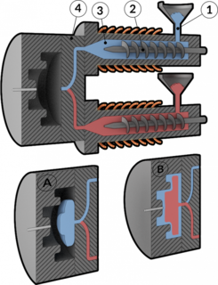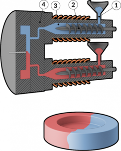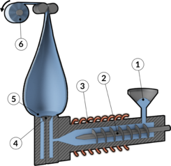 Plastpellets [1] matas via en behållare in till en roterande skruv [2] som genom spiralformen för pelletsen framåt genom en upphettad kammare [3]. Pelletsen upphettas gradvis och har övergått till en homogen plastsmälta när den när den närmar sig slutet av spiralskruven.