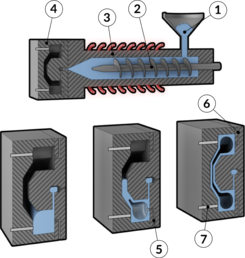 Den smälta massan trycks in i en gjutformen [4] genom att hela skruven trycks fram genom en pålagd presskraft. Efter massan stelnat så separeras formhalvorna och detaljen avlägsnas med hjälp av uttryckare [5].