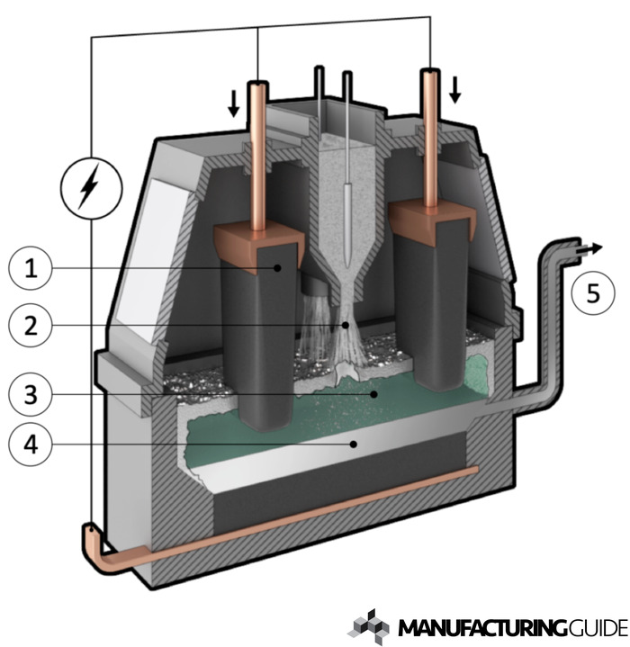 Framställning av primäraluminium genom smältelektrolys. Beskrivning Hur fungerar metoden Efter framställning av aluminiumoxid genom Bayermetoden löses aluminiumoxiden i en saltsmälta bestående av aluminiuimflorid och kryolit. Likström tillförs genom anoderna [1] som består av kolblock, dessa förbrukas under processen genom kemiska reaktioner med syre och måste därför ersättas under genomförandet. Aluminiumoxid tillsätts kontinuerligt till smältan för att behålla korrekta halter oxid[2]. Under elektrolys av saltsmältan sönderdelas aluminiumoxiden genom att aluminiumjonerna reagerar med katoden och att syrejonerna reagerar med anoden[3]. Aluminiumjonerna reduceras till aluminiummetall samtidigt som syrejonerna bildar koloxider med kolet från anoden. De kemiska reaktioner som sker under processens gång beskrivs enligt följande: 2AlO3 + 3C --> 4Al + 3CO2. Eftersom att aluminium har en högre densitet än elektrolyten (saltsmältan) så sjunker den till bottnen av ugnen under processens gång [4]. Genom ett undertryck sugs den flytande aluminiumen upp till en tappskänk för vidare transport till gjuteriet [5] där gjutningen sker via Semi-kontinuerlig stränggjutning eller Tackgjutning. Hall-Heroult processen resulterar i ett väldigt rent primäraluminium där man kan förvänta sig renlighetsgrader på minst 99,5%. Högre renhet kan uppnås via ytterligare elektrolysförfarande eller zonsmältning. De kvarstående föroreningarna handlar oftast om kisel och järn. Elektrolys Metod för att driva kemiska reaktioner som annars inte uppstår spontant. Läs merFramställning av aluminiumoxid genom Bayermetoden Framställning av aluminiumoxid genom upplösning av bauxit. Läs merJärn Om man inte direkt syftar på grundämnet Fe så menar man kol-legeringar på över 2%, vanligtvis mellan 3,5-4,5%, som gör att den ej är smidbar. Läs merSemi-kontinuerlig stränggjutning Gjutmetod för icke-ferritiska metaller, exempelvis Koppar- och Aluminiumlegeringar, som genom kylning samt dragning skapar en gjutsträng. Läs merStränggjutning Gjutmetod som genom kraftig vattenkylning skapar en oavbruten gjutsträng Läs merTackgjutning Kontinuerlig gjutmetod där tackor gjuts i fasta öppna formar med automatisk tömning Läs mer Hall Héroult
