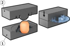 Smidande bearbetning där arbetsstycket utsätts för flera slag av ett dorn som ej omger hela arbetsstycket. Beskrivning Hur fungerar metoden Dornet [1] i denna metod är till skillnad från sänksmidning inte omgivande av arbetsstycket utan har en mycket enklare utformning, oftast en platt yta. Således är slutlig form inte bunden till dornets utformning utan man har stor frihet att forma arbetsstycket till olika former. Arbetsstycket, så kallat pressgöt, hettas upp till dess rekristallationstemperatur. En tång [2] greppar och positionerar götet på ett städ varpå dornet trycks eller slås ned med en pålagd presskraft. Tången förflyttar arbetstycket axiell och/eller roterar det mellan presslagen för att på så sätt gradvis foma arbetsstycket till eftersträvad form för att minimera slutlig maskinell bearbetning, vanligvis svarvning eller fräsning. Pressning längs sidorna kallas för räcksmide medan axiell pressning kallas för stuksmide. Vid ringvalsning så föregås detta av att ett runt göt stukas och hålas genom en typ av friformssmide innan det flyttas över till ringvalsningen. Eftersom materialet varmbearbetas rekristalliseras nya korn efter smidet vilket ger isotropa egenskaper. Jämfört med gjutna detaljer i samma material så har en smidd detalj högre sträckgräns, brottgräns, utmattningshållfasthet samt större brottförlängning. Detta kan dock i vissa fall kompenseras i gjutning då andra legeringar kan användas för att uppnå detta men då till en ökad materialkostnad. En gjuten produkt kräver vanligtvis mindre bearbetning. Brottförlängning Den lokala förlängningen av materialet intill ett materialbrott Läs merBrottgräns Mängden dragkraft ett material kan motstå innan brott uppstår. Läs merIsotropa egenskaper Ett material som är isotropiskt har samma fysikaliska egenskaper i alla riktningar. Pressgöt Pressgöt framställs genom gjötgjutning till stora ämnen som kan vara fyrk-, sex-, åttakantiga, runda eller ovala. Läs merPresskraft Axiella rörelser som krävs vid bearbetningsmetoder såsom pressning, stansning och kantbockning genereras vanligtvis av hydralisk eller mekanisk anordning. Valet av kraftkälla beror på applikationens krävda slaglängd, presshastighet och pesskraft. Ringvalsning Valsande bearbetning där arbetsstycket rullas mellan två valsar för att minska den radiella tjockleken och öka diametern. Läs merRäcksmide Smidning av metall där ett avlångt arbetsstyckes långsida pressas och således samtidigt förlängs Sträckgräns Kraften som krävs för att uppnå plastisk (bestående) deformation hos en metall. Läs merStuksmide Smidning av metall där ett avlångt arbetsstycke pressas axiellt och vanligtvis förkortas, sk stukning Sänksmidning Smidande bearbetning där ett arbetsstycket med hjälp av ett eller flera slag deformeras mellan två slutna formhalvor. Läs merUtmattningshållfasthet Ett materials förmåga att motstå upprepade varierande belastningar som ej uppnår materialets brottgräns Läs mer Friformsmidning