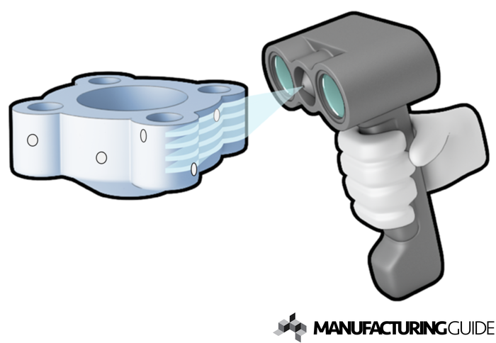 Handhållen 3D-scanning där reflektionen från ett projicerat mönster fångas upp av kameror för att beräkna mätpunkter. Beskrivning Hur fungerar metoden Mätningen utförs genom att en uppsättning linjära mönster projiceras mot detaljen som skall mätas. Projiceringen reflekteras mot detaljens yta och kanterna på mönstret fångas upp av en eller fler kameror för att översättas till exakta mätpunkter i X/Y/Z-planet genom så kallad triangulering. Metoden går även under benämningen Blue light alt. White light scanning vilket numera ersatts av namnet Strukturerat ljus scanning. Till skillnad mot Laser-scanning så nyttjar man inte överlappning för att sy ihop de olika mätningarna till en fullständig detalj utan här nyttjar man istället en uppsättning referensprickar som placeras direkt på mätobjektet eller på mätfixturen. Dessa referenspunkter mäts upp för att skapa ett referenssystem runt detaljen. Vid själva strukturerat ljus scanningen så mäts detaljes yta upp i förhållande till referensprickarna vilka sedan nyttjas för att sy ihop de olika scannade ytorna till en fullständigt uppmätt detalj. Mycket stora objekt kan på så sätt mätas upp då obegränsat antal referensprickar kan placeras ut. Handscannern kan kombineras med industrirobot, mätarm och/eller tracker för att automatisera mätprocessen, öka procisionen och/eller utöka mätområdet. LASER Står för Light Amplification by Stimulated Emission of Radiation Läs merStrukturerat ljus Ett samlingsnamn för en speciellt område av 3D scanning Läs merTriangulering Metod att beräkna en punkts position utifrån kända basavstånd [x] och vinkel [α] på reflektionen Läs mer Handhållen 3D-scanning med strukturerat ljus