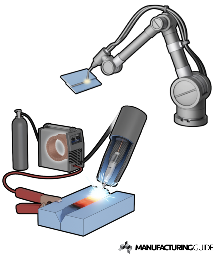 MIG-svetsning med svetsrobot sammanfogar två arbetsstycken genom kontinuerlig tillförsel av en metallelektrod som smälts i en ljusbåge skyddad av en inert gas. Beskrivning Hur fungerar metoden MIG-svetsning med svetsrobot föregås vanligtvis av att den planerade fogens yta rengörs för att motverka att den kontamineras under svetsprocessen samt för att få svetsen att fästa optimal. En trådrulle [1] matar konstant ut en metalltråd, vilken också agerar elektrod. Arbetsstycket och elektroden spänningssätts och detta ger upphov till en ljusbåge. Denna skapar en hög värmeenergi, vilket leder till att elektroden och delar av arbetsstycket smälts och slutligen skapar den önskade svetsfogen. Under processen tillförs en inert gas [2], vanligast förekommande med argon. Denna har till syfte att skapa en skyddande atmosfär för både ljusbågen och smältan. MIG/MAG-svetsning kan genomföras med CMT-teknik som ger i princip sprutfria svetsfogar och eliminerar således kostnader för efterbearbetning. CMT-teknik Cold Metal Transfer är en svetsteknik inom MIG/MAG där tillsatsmaterialet tillförs med digitalt övervakad pendlande frammatning av tråd. Läs merInert gas Gas som inte reagerar med omgivningen Ljusbåge Kontinuerlig luftburen elektrisk urladdning Läs merMAG-svetsning MAG-svetsning sammanfogar två arbetsstycken genom kontinuerlig tillförsel av en metallelektrod, vilken smälts i en ljusbåge skyddad av en aktiv gas. Läs merMIG-svetsning MIG-svetsning sammanfogar två arbetsstycken genom kontinuerlig tillförsel av en metallelektrod som smälts i en ljusbåge skyddad av en inert gas Läs mer MIG-svetsning Robotiserad