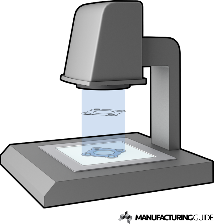 Mätmaskin som läser av hålkonturer på mätobjektet Beskrivning Hur fungerar metoden Mätobjetet placeras på ett bakgrundbelyst glasbord där det ljus som passerar fångas upp av en ovanliggande sensor. På så sätt kan konturerna avläsas och omvandlas till mätpunkter.