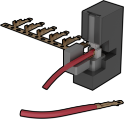 Vid automatiserad kontaktpressning så är kabelskorna fästa i varandra och matas fram en i taget för att klippas loss från övriga samtidigt som kabelskon pressas fast.