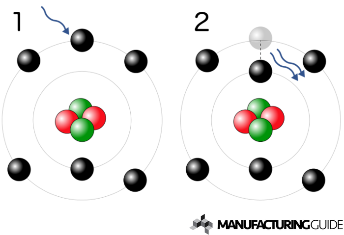 Då en elektron, som tidigare genom tillförd energi lyfts till ett yttre skal, stimuleras att falla tillbaka till sitt normala läge/skal.