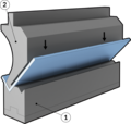 Tillverkningsmetod Bockande bearbetning där plåten kläms fast mot arbetsbordet med en övre uppdelad kilformad pressfot medan en roterande del bockar plåten.