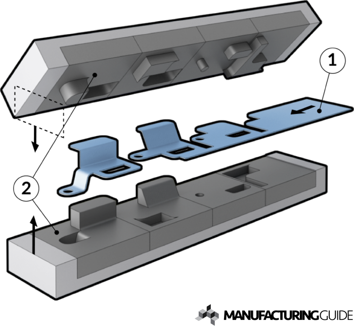 Progressiv pressning av bandmaterial formar/klipper/stansar utgångsmaterialet steg för steg till en färdig detalj. Beskrivning Hur fungerar metoden Progressiv pressning utförs genom att det bandformade arbetsstycket [1] matas från en rulle och passerar först en riktstation då en helt plan plåt är nödvändig för processen. Bandet bearbetas av en uppsättning övre och undre verktyg [2] monterade som en processlinje. Inför varje presscykel så matas bandet fram ett steg innan verktygen pressas mot bandet med en pålagd presskraft. Efter att verktygen öppnats igen matas arbetsstyecke fram ett steg i processen och en ny pressning utförs. Som sista steg frigörs vanligtvis färdig detalj från bandet. Verktygen liknar till stor del de som används i stansning men är här specialanpassade till en specifik detalj för att kunna framställa denna i stora volymer på ett så effektivt sätt som möjligt. Vardera verktyg kan innehålla en mängd olika typer av operationer som utsätter bandet för stansning, klippning och/eller plastisk formning av materialet. Presskraft Axiella rörelser som krävs vid bearbetningsmetoder såsom pressning, stansning och kantbockning genereras vanligtvis av hydralisk eller mekanisk anordning. Valet av kraftkälla beror på applikationens krävda slaglängd, presshastighet och pesskraft. Progressiv pressning av bandmaterial Processfoton Processfilmer