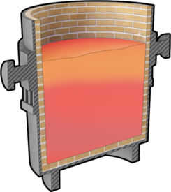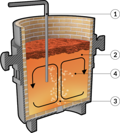 Smältugn där järnmalm, koks och slaggbildare smälts ned för att framställa råjärn. Beskrivning Hur fungerar metoden Masugnsprocessen är en kontinuerlig nedsmältningsprocess för reduktion av järnoxid till råjärn. I toppen av masugnen [1] tillsätts lager av slaggbildare, anrikad järnmalm och koks, som utgör processens bestickning [2]. I nedre delen av ugnen tillsätts 1000-gradig luft [3] under hög hastighet, så kallad blästerluft. Blästerluften reagerar med kolet i koksen varvid en förbränning sker [4]. Koloxid- samt koldioxidgas med mycket hög temperatur bildas [5]. Gasen strömmar uppåt i masugnen och värmer upp beskickningen som gradvis sjunker. Den nedre delen av masugnen kallas för värmezonen, och det är först när beskickningen når denna del som nedsmältning sker. Järnoxiden genomgår reduktion då den kommer i kontakt med uppåtstigande gasen [6]. I det slutgiltiga reduktionssteget bildas rent järn och koldioxid. Både beskickning och blästerluft tillsätts kontinuerligt. Tappning sker semi-kontinuerligt ungefär en gång per timme. Vid det flesta anläggningar leds processgasen ut ur masugnen för att vidare användas som en energikälla. Processcykeln från påfyllnad av bestickning till tappning av råjärn tar mellan sex till åtta timmar. I botten av masugnen leds råjärnet ut i ett undre tapphål ned i en skänk eller torped [7]. Slaggen som flyter ovanpå smältan leds ut ur samma tapphål eller ett övre tapphål till en slaggskänk [8]. Därefter går smälta vidare till svavelrening för framställning av stål alternativt direkt till tackgjutning Flödesöversikt - Framställning av kolstål Bestickning Summan av alla råmaterial som en ugn kontinuerligt eller charge-vis fylls på med. Läs merBlästerluft Luft som trycks in i nederdelen av masugnsprocessen. Det är vanlig luft som förhettas genom värmeväxling mot de heta restgaserna från processen. Järn Om man inte direkt syftar på grundämnet Fe så menar man kol-legeringar på över 2%, vanligtvis mellan 3,5-4,5%, som gör att den ej är smidbar. Läs merJärnmalm Råmaterial bruten från en gruva och innehållandes en majoritet järnoxid som sedan används för framställning av råjärn. Järnmalmen anrikas för att öka procentuella mängden järnoxid och reducera mängden oönskade ämnen. Läs merKoks Förädlat stenkol som används som reagensmedel vid exempelvis järnframställning i en masugn. Läs merReduktion Reaktion då en elektron tas upp av huvudreaktanten. Medför för det flesta reaktioner att en syrejon avlägsnas. Läs merSkänk Behållare för flytande metall. Läs merSlaggbildare Slaggbildare används för att underlätta bildande av en slagg med önskade egenskaper, som har möjlighet att separera oönskade ämnen från metallbadet. Läs merSvavelrening Svavel har en (oftast) negativ inverkan på färdiga stålprodukter. Raffinering av svavel är dessutom relativt svårt när väldigt låga svavelhalter önskas. På grund av detta brukar svavelrening som enhetsoperation utföras vid flera eller samtliga processteg under ståltillverkningen. Läs merTackgjutning Kontinuerlig gjutmetod där tackor gjuts i fasta öppna formar med automatisk tömning Läs merTorped Större kärl monterad på järnvägsvagn för itappning och behandling av flytande metall. Råjärnsframställning genom masugn