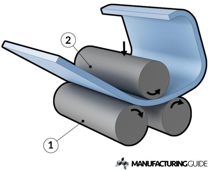 Bockande bearbetning där plåten passerar mellan styrda valsar som ger en löpande bockning med möjlighet till varierande radie. Beskrivning Hur fungerar metoden Arbetsstycket placeras ovanpå två nedre rullar [1]. En övre styrd rulle [2] pressas ned ytan mellan de två andra valsarna genom varierat tryck/position. Detta orsakar bockning genom plastisk deformation av arbetsstycket. Genom att variera den övre rullens position under bockningsförloppet kan en mängd olika bockningstvärsnitt genereras. För att uppnå eftersträvad radie på arbetsstycket upprepas processen tills eftersträvad radie/tvärsnitt uppnåtts. Plastisk deformation Formförändring av material genom att lägga på en så pass stor kraft att den elastiska förmågan överskrids och den inre strukturen förskjuts. Efter att kraften avlägsnas sker en viss återfjädring för de flesta material. Rundvalsning av plåt, CNC Processfoton Processfilmer