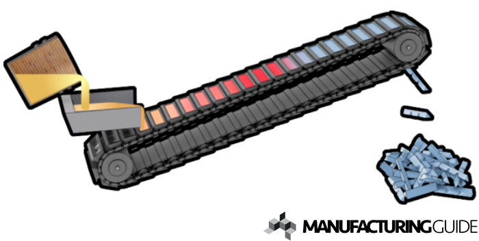 Kontinuerlig gjutmetod där tackor gjuts i fasta öppna formar med automatisk tömning Beskrivning Hur fungerar metoden Smält metall hälls över till ett kärl som leder vidare och fördelar smältan löpande genom en eller flera påfyllningspipar. Smältan rinner ned i gjutfomar monterade i linje på ett cirkulerande transportband där stelning sker, ofta understödd av kylande medie, i sådan takt att stelnade tackor kan avlägsnas i slutet av transportbandet. Formarna kan därefter smörjas och upphettas för att återigen fyllas med smälta. Metall Metaller är kemiska föreningar där atomerna är ordnade på ett regelbundet sätt vilket ger de typiska dragen för en metall. Läs mer Tackgjutning
