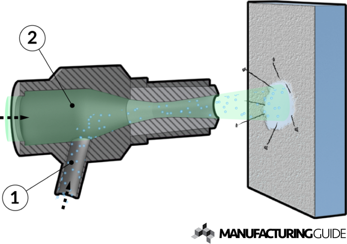 Blästrande bearbetning där torrispellets skjuts ut mot ett arbetsstycke i höga hastigheter. Beskrivning Hur fungerar metoden Torrispellets [1] tillförs en tryckluftssatt blandingskammare [2] och skjut med hög hastighet ut genom genom munstycket för att träffa arbetsstycket. När pelletsen träffar kontakytan underkyls kontaktytan och en termisk shock uppstår hos eläggningen vilket leder till att skjuvspänningar uppstår. På så sätt släpper kontamineringen och avlägsnas av tryckluften. Torrisblästring Processfilmer För- & Nackdelar I jämförelse med alternativa metoder Rengöring på plats reducerar driftstopp Ingen skada från utrustning Reducerad eller eliminerad användning av lösningsmedel Icke-abrasiv rengöringsmetod Icke-flammbar rengöringsmetod Icke-ledande rengöringsmetod Ren och godkänd för matindustrin Relativt hög kostnad