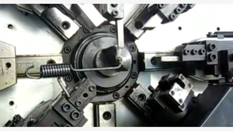 Plastisk bearbetning av metalltråd där tråden matas fram och bockas med en uppsättning specialanpassade verktyg för optimal produktivitet. Beskrivning Hur fungerar metoden Arbetsstycket som består av en metalltråd mats fram från en spole centrumdynan. Runt centrymdynan sitter ett antal fristående verktygshållare som växelvis skjuts in mot dynan för att bearbeta tråden. Dessa verktyg kan bestå av olika uppsättningar standardverktyg (se Trådbockning med standardverktyg) eller specialtillverkade verktyg för specifika bearbetningsmoment där tråden genomgår plastisk deformation. Tråden matas fram successivt genom dynan och roteras tillsammans med dynan inför varje bearbetningssteg. Färdig detalj frigörs genom att tråden klipps av på önskat ställe. Genom att använda specialverktyg kan man uppnå högre produktivitet än vid nyttjande av standardverktyg. Dock medför specialverktyg en betydligt högre initial kostnad. Plastisk deformation Formförändring av material genom att lägga på en så pass stor kraft att den elastiska förmågan överskrids och den inre strukturen förskjuts. Efter att kraften avlägsnas sker en viss återfjädring för de flesta material. Trådbockning med standardverktyg Trådbockning med standardverktyg bearbetar metalltråd genom att stegvis mata fram och bocka tråden med standardverktyg. Läs mer Trådbockning med modulverktyg Processfoton Processfilmer