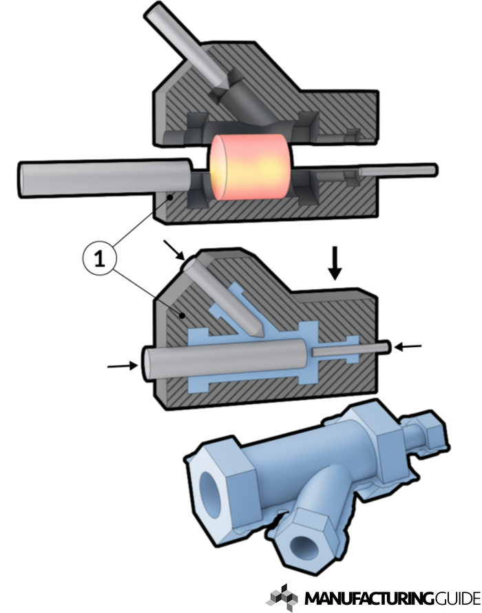 Formpressning av icke järnmetall upphettad till strax under smälttemperaturen Beskrivning Hur fungerar metoden Råmaterialet kapas upp i lämpliga bitar, vanligtvis från stång, och hettas upp till strax under smälttemperaturen. Därefter placeras ämnet mellan två eller flera formar för att därefter pressas med en pålagd presskraft. Metoden används med fördel för framställning av flödeskomponenter och i dessa fall pressas ett eller flera dorn in i formutrymmet för att på så sätt skap en så nära slutform som möjligt vilket minimerar efterbearbetning. Pga det höga trycket så kan gjutskägg uppstå vilket, vid behov, avlägsnas i en efterföljande process. Gjutskägg Vid gjutning med sammansatta, icke skarvfria formar så uppstå kan smältan träng in i skarvarna och bilda så kallat gjutskägg Läs merPresskraft Axiella rörelser som krävs vid bearbetningsmetoder såsom pressning, stansning och kantbockning genereras vanligtvis av hydralisk eller mekanisk anordning. Valet av kraftkälla beror på applikationens krävda slaglängd, presshastighet och pesskraft. Bearbetningsbara material Ämne Koppar Mässing Varmpressning av ickejärnmetaller Processfoton Processfilmer Produktexempel Flödeskoppling Berörda tillverkningsmetoder Varmpressning av ickejärnmetaller Supportsvarvning - Styrd
