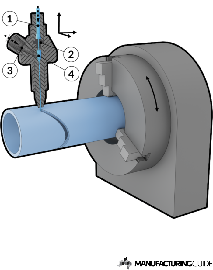 Vattenskärning av rör utförs vanligtvis som en tillsats i en ordinarier vattenskärnmaskin där arbetsstycket spänns upp in en roterbar horisontell chuck nedsänkt i vattenbadet.